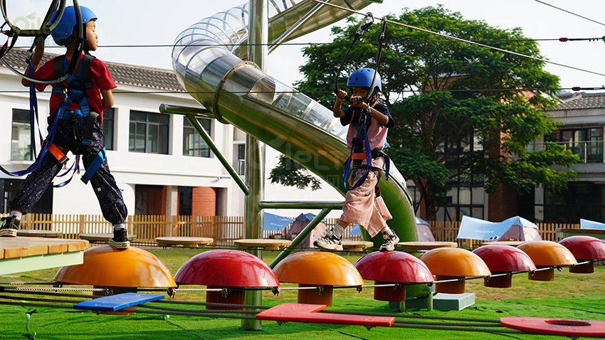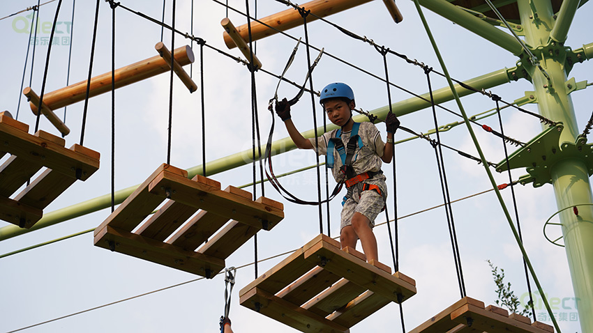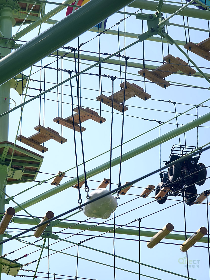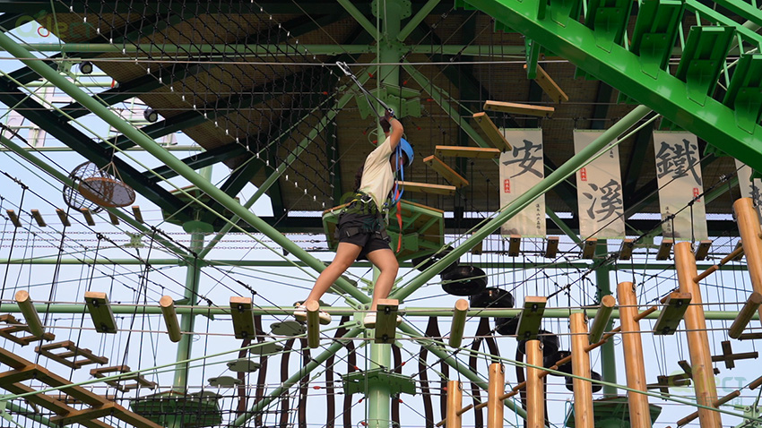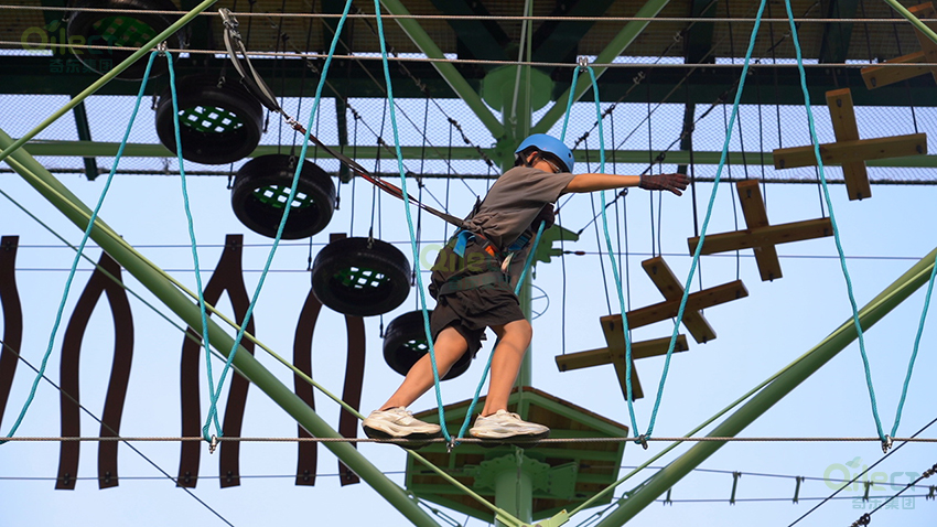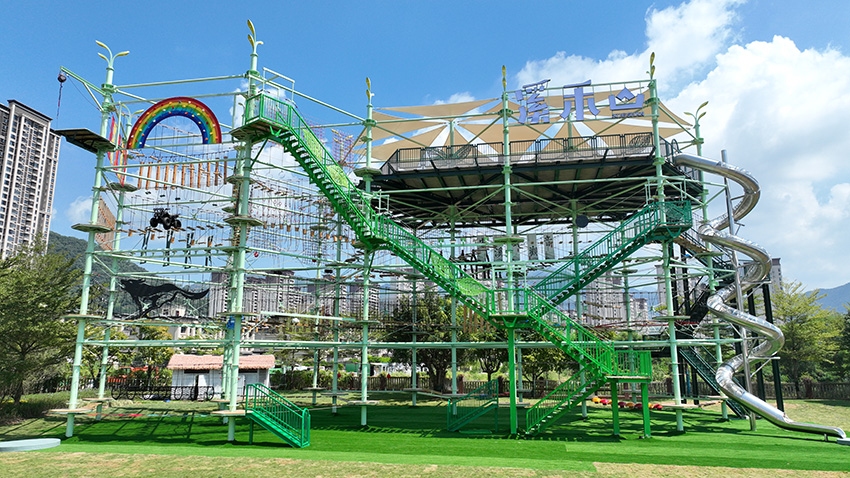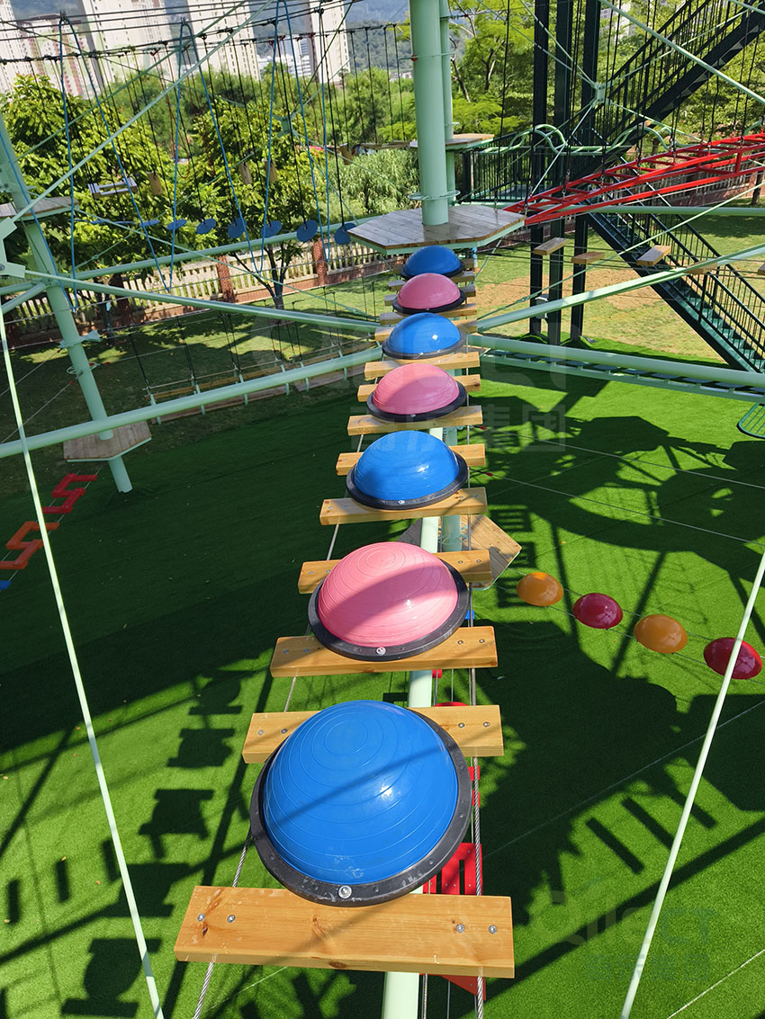 針對(duì)6歲以上兒童及初次嘗試的家庭客群,設(shè)置時(shí)空網(wǎng)道、蛇形橋、I LOVE YOU、蘑菇橋、阻礙木、茶則滑板、匍匐前進(jìn)、XIHESHAN、障礙高低樁、蹺蹺板等較低難度項(xiàng)目。
