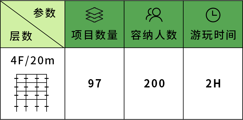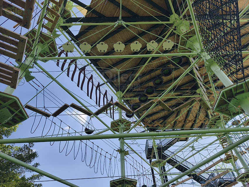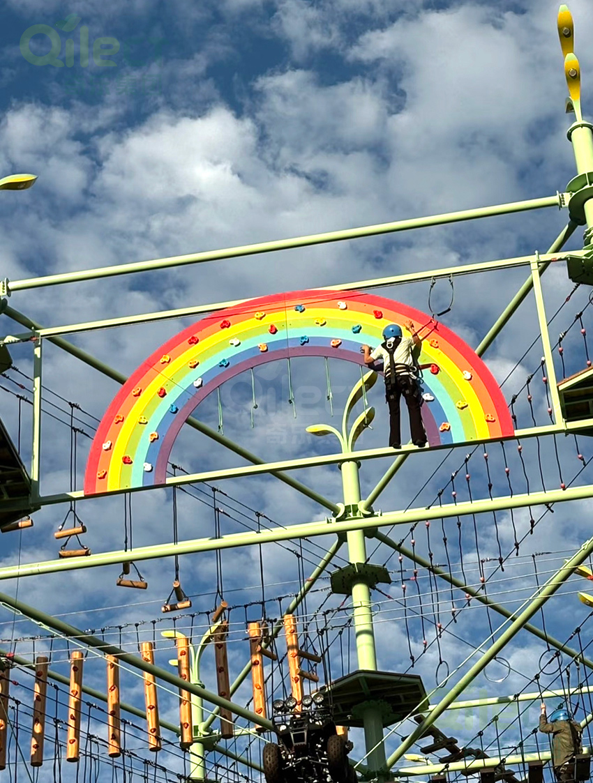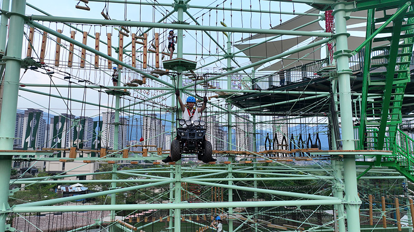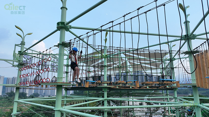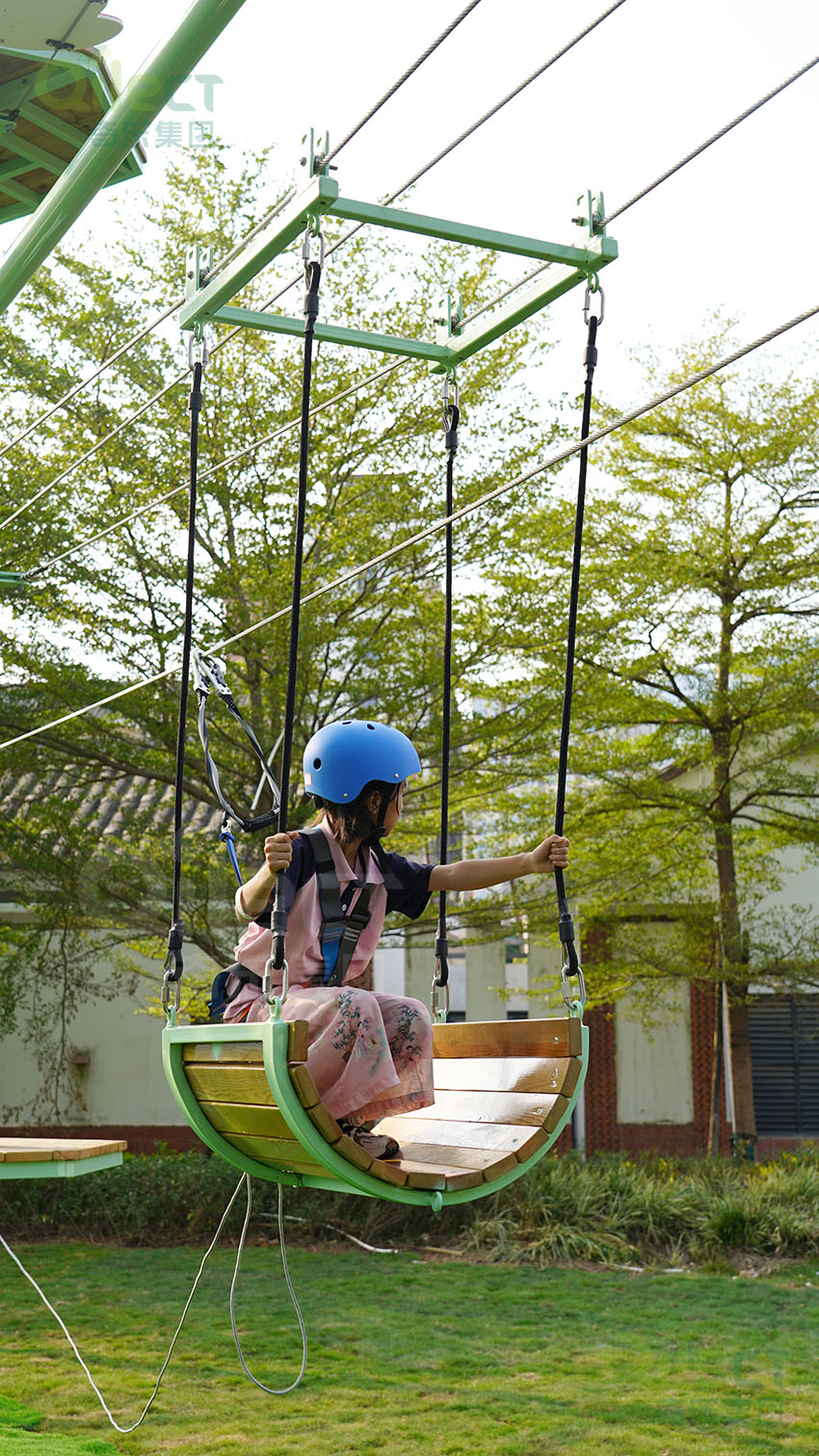 針對(duì)6歲以上兒童及初次嘗試的家庭客群,設(shè)置時(shí)空網(wǎng)道、蛇形橋、I LOVE YOU、蘑菇橋、阻礙木、茶則滑板、匍匐前進(jìn)、XIHESHAN、障礙高低樁、蹺蹺板等較低難度項(xiàng)目。